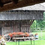 Das riesige, imposante Vordach vom Strohhaus bot Platz und Schutz für ca. 50 Gäste und Musikanten, denn kaum das die Predigt anfing, begann es wie aus Kübeln zu giessen. Zu den Klarinetten- und Handörgeliklängen prasselte der Regen aufs Dach, und dem, der nicht den besten Platz ausgesucht hatte, in den Nacken.
